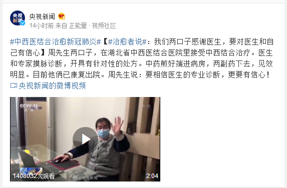 周先生两口子,在湖北省中西医结合医院里接受中西结合治疗。医生和专家摸脉诊断,开具有针对性的处方。中药煎好端进病房,两副药下去,见效明显。目前他俩已康复出院。周先生说:要相信医生的专业诊断,更要有信心!