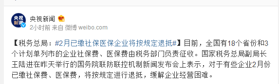 目前,全国有18个省份和3个计划单列市的企业社保费、医保费由税务部门负责征收。国家税务总局副局长王陆进在昨天举行的国务院联防联控机制新闻发布会上表示,对于有些企业2月份已缴社保费、医保费,将按规定进行退抵,缓解企业经营困难。