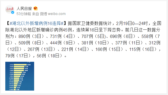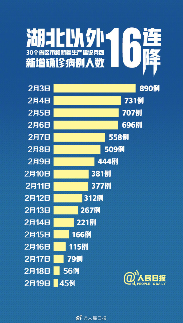 据国家卫健委数据统计,2月19日0—24时,全国除湖北以外地区新增确诊病例45例,连续第16日呈下降态势。前几日这一数据分别为:890例(3日)、731例(4日)、707例(5日)、696例(6日)、558例(7日)、509例(8日)、444例(9日)、381例(10日)、377例(11日)、312例(12日)、267例(13日)、221例(14日)、166例(15日)、115例(16日),79例(17日),56例(18日)。