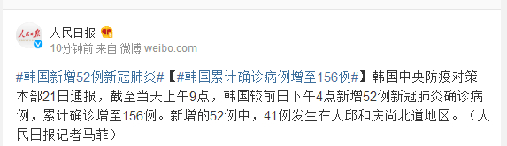 韩国中央防疫对策本部21日通报,截至当天上午9点,韩国较前日下午4点新增52例新冠肺炎确诊病例,累计确诊增至156例。新增的52例中,41例发生在大邱和庆尚北道地区。(人民日报记者马菲)