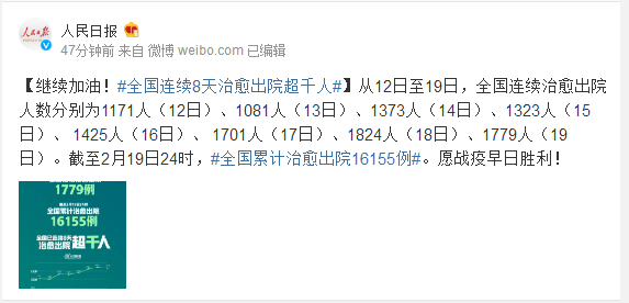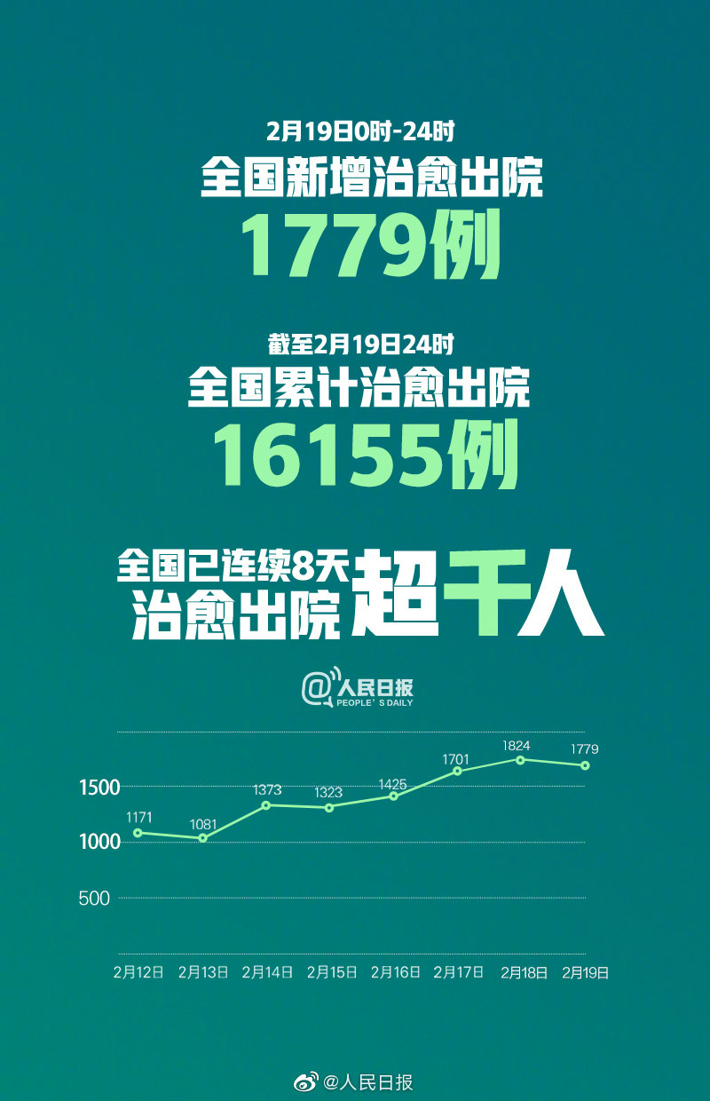 从12日至19日,全国连续治愈出院人数分别为1171人(12日)、1081人(13日)、1373人(14日)、1323人(15日)、 1425人(16日)、 1701人(17日)、1824人(18日)、1779人(19日)。截至2月19日24时,#全国累计治愈出院16155例#。愿战疫早日胜利!