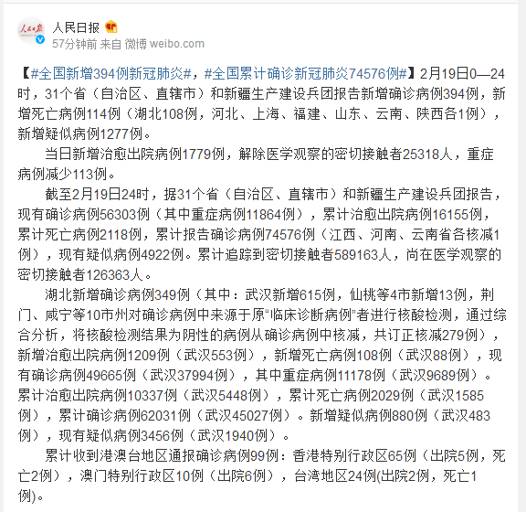 2月19日全国新增394例新冠肺炎 全国累计确诊新冠肺炎74576例