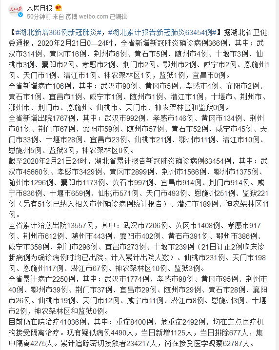 据湖北省卫健委通报,2020年2月21日0—24时,全省新增新冠肺炎确诊病例366例,其中:武汉市314例、黄冈市16例、荆州市6例、黄石市5例、随州市4例、十堰市3例、仙桃市3例、襄阳市2例、孝感市2例、荆门市2例、鄂州市2例、咸宁市2例、恩施州1例、天门市1例、潜江市1例、神农架林区1例,监狱1例,宜昌市0例。