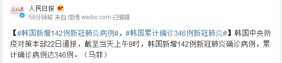 韩国中央防疫对策本部22日通报,截至当天上午9时,韩国新增142例新冠肺炎确诊病例,累计确诊病例达346例。(马菲)