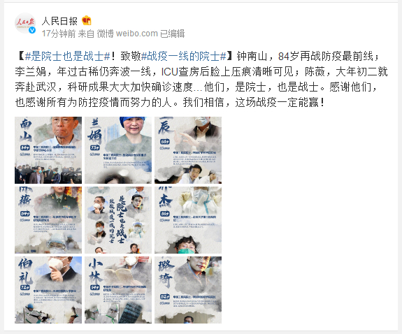 钟南山,84岁再战防疫最前线;李兰娟,年过古稀仍奔波一线,ICU查房后脸上压痕清晰可见;陈薇,大年初二就奔赴武汉,科研成果大大加快确诊速度…他们,是院士,也是战士。感谢他们,也感谢所有为防控疫情而努力的人。我们相信,这场战疫一定能赢!