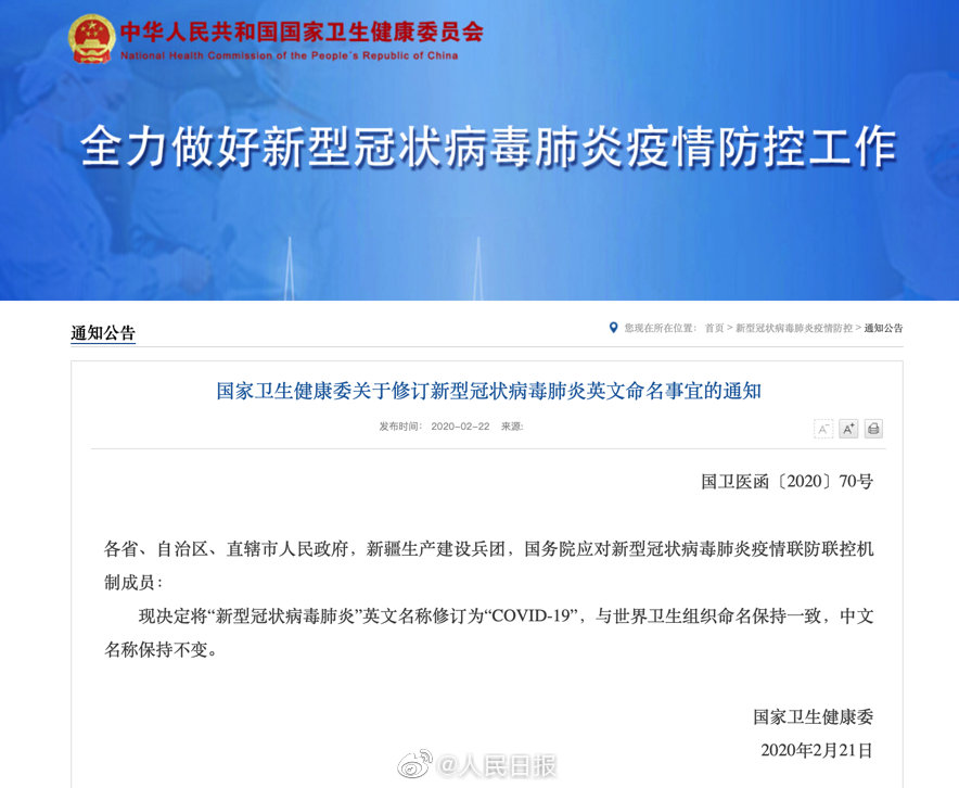 国家卫健委发布消息:现决定将“新型冠状病毒肺炎”英文名称修订为“COVID-19”,与世界卫生组织命名保持一致,中文名称保持不变。