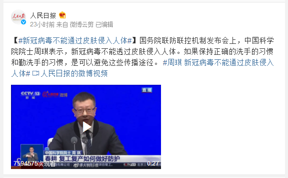 国务院联防联控机制发布会上,中国科学院院士周琪表示,新冠病毒不能透过皮肤侵入人体。如果保持正确的洗手的习惯和勤洗手的习惯,是可以避免这些传播途径。