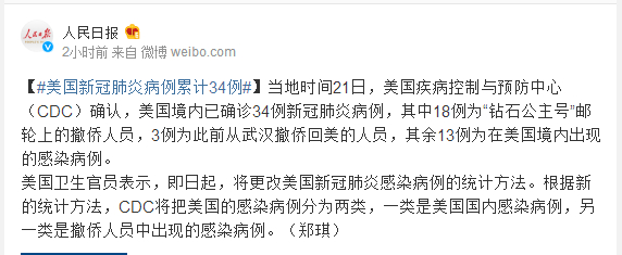 当地时间21日,美国疾病控制与预防中心(CDC)确认,美国境内已确诊34例新冠肺炎病例,其中18例为“钻石公主号”邮轮上的撤侨人员,3例为此前从武汉撤侨回美的人员,其余13例为在美国境内出现的感染病例。