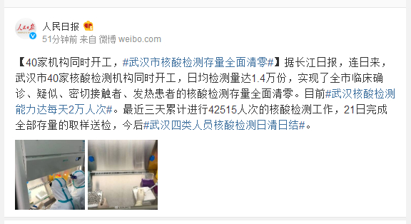 据长江日报,连日来,武汉市40家核酸检测机构同时开工,日均检测量达1.4万份,实现了全市临床确诊、疑似、密切接触者、发热患者的核酸检测存量全面清零。目前#武汉核酸检测能力达每天2万人次#。最近三天累计进行42515人次的核酸检测工作,21日完成全部存量的取样送检,今后#武汉四类人员核酸检测日清日结#。