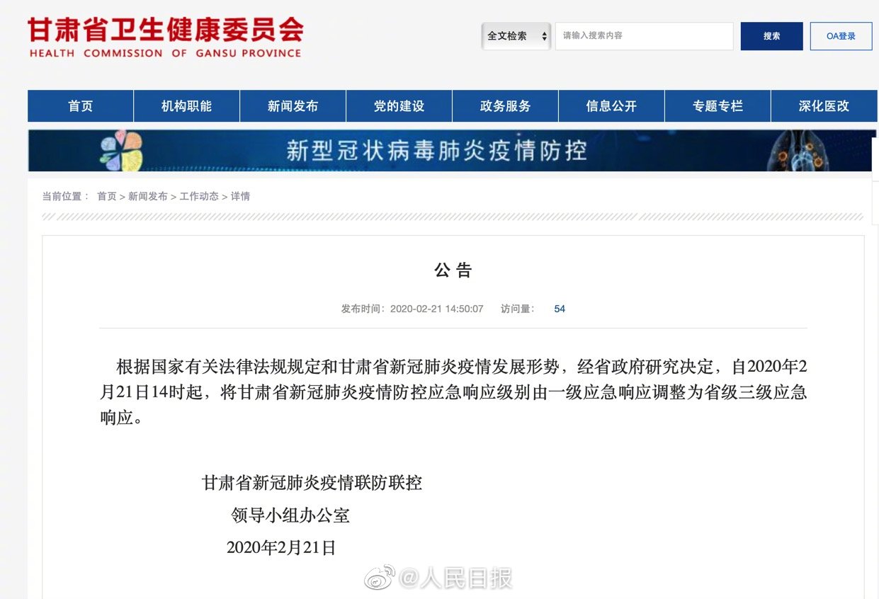 据甘肃省卫健委网站,根据国家有关法律法规规定和甘肃省新冠肺炎疫情发展形势,经省政府研究决定,自2020年2月21日14时起,将甘肃省新冠肺炎疫情防控应急响应级别由一级应急响应调整为省级三级应急响应。