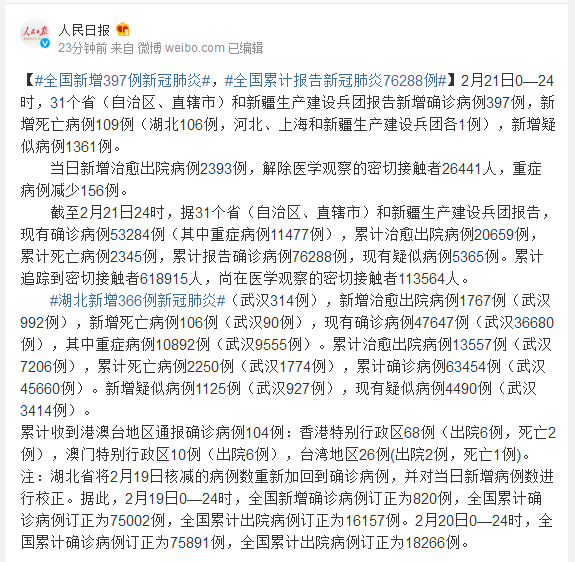 2月21日0—24时,31个省(自治区、直辖市)和新疆生产建设兵团报告新增确诊病例397例,新增死亡病例109例(湖北106例,河北、上海和新疆生产建设兵团各1例),新增疑似病例1361例。