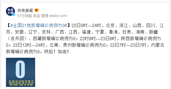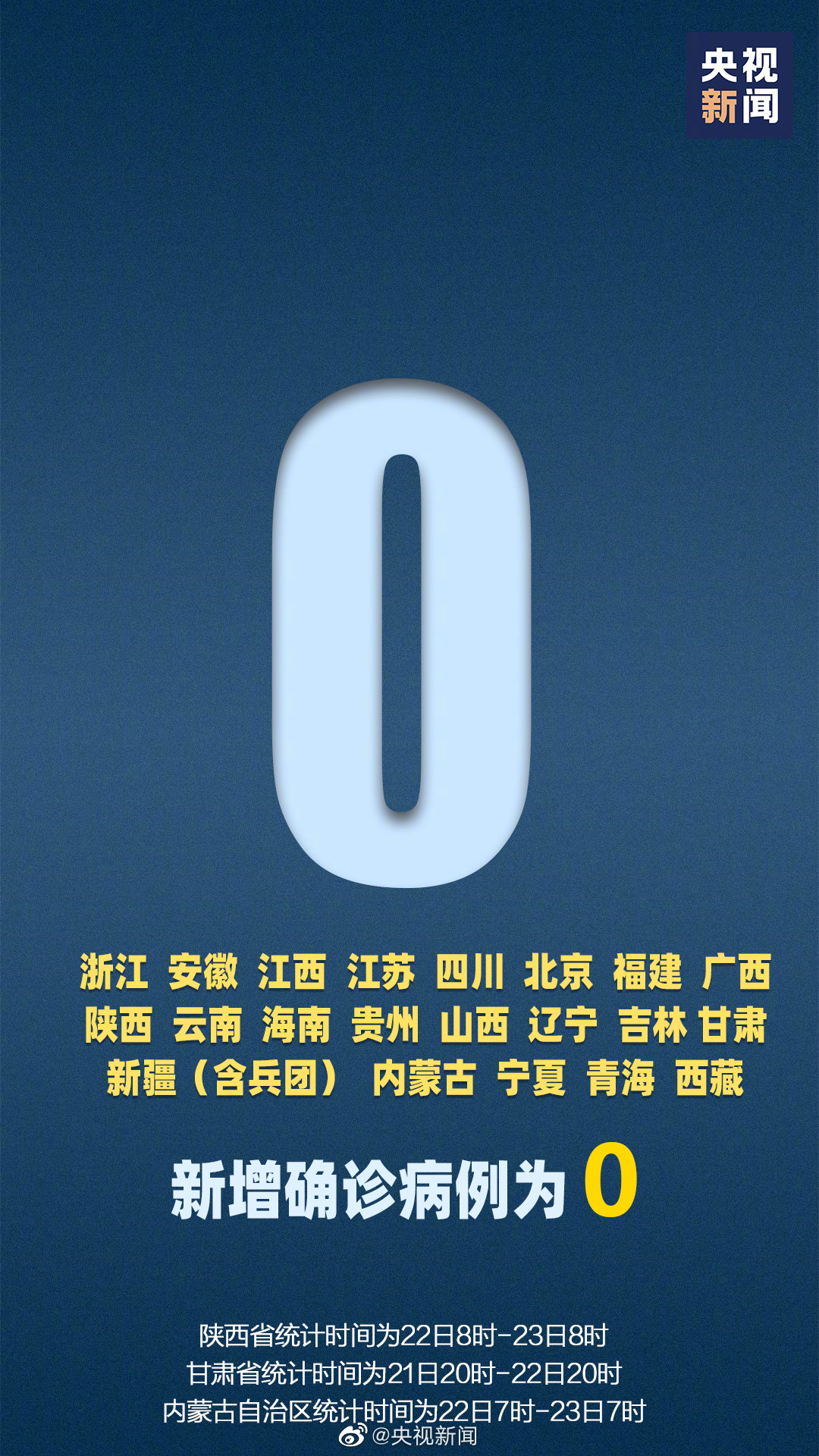 22日0时—24时,北京、浙江、山西、四川、江苏、安徽、辽宁、吉林、广西、江西、福建、宁夏、青海、甘肃、海南、新疆(含兵团)、西藏新增确诊病例为0;22时8时—23日8时,陕西新增确诊病例为0;22日12时—24时,云南、贵州新增确诊病例为0;22日7时—23日7时,内蒙古新增确诊病例为0。转起!加油!