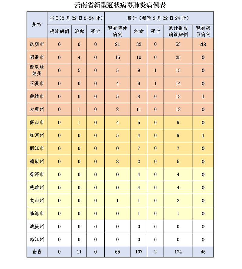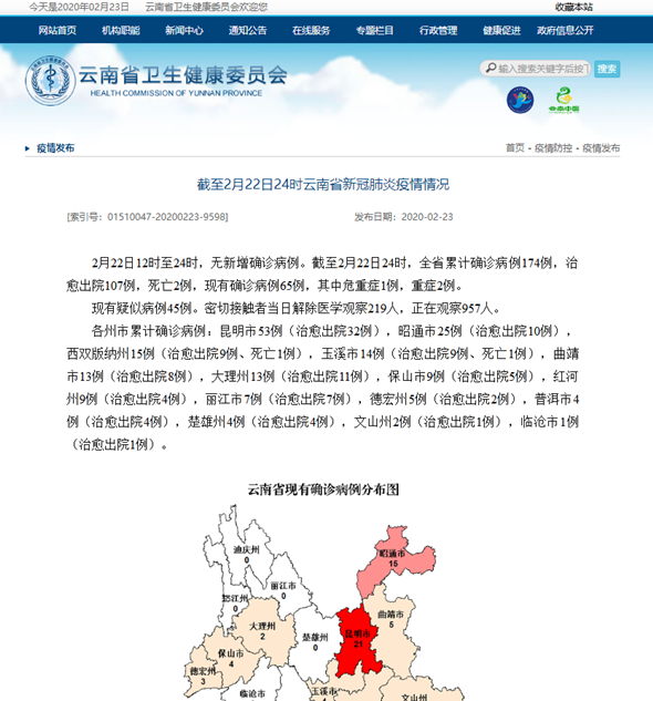 2月22日12时至24时,无新增确诊病例。截至2月22日24时,全省累计确诊病例174例,治愈出院107例,死亡2例,现有确诊病例65例,其中危重症1例,重症2例。