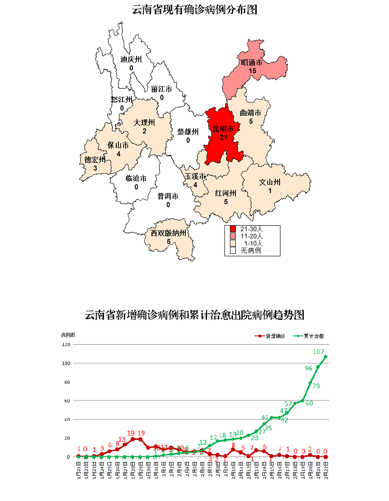 各州市累计确诊病例:昆明市53例(治愈出院32例),昭通市25例(治愈出院10例),西双版纳州15例(治愈出院9例、死亡1例),玉溪市14例(治愈出院9例、死亡1例),曲靖市13例(治愈出院8例),大理州13例(治愈出院11例),保山市9例(治愈出院5例),红河州9例(治愈出院4例),丽江市7例(治愈出院7例),德宏州5例(治愈出院2例),普洱市4例(治愈出院4例),楚雄州4例(治愈出院4例),文山州2例(治愈出院1例),临沧市1例(治愈出院1例)。