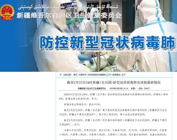 截至2月22日24时,新疆(含兵团)累计报告新型冠状病毒肺炎确诊病例76例(新疆维吾尔自治区52例、新疆生产建设兵团24例),累计死亡病例2例,累计治愈出院病例25例。