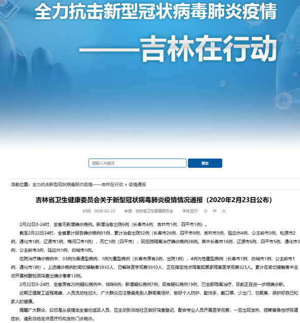 截至2月22日24时,全省累计报告确诊病例91例,累计治愈出院52例(长春市26例,四平市9例,吉林市5例,延边州4例,公主岭市3例,松原市2例,通化市1例,辽源市1例,梅河口市1例),死亡1例(四平市),现在院隔离治疗确诊病例38例。其中长春市19例,辽源市6例,四平市5例,通化市3例,公主岭市3例,延边州1例,白城市1例。