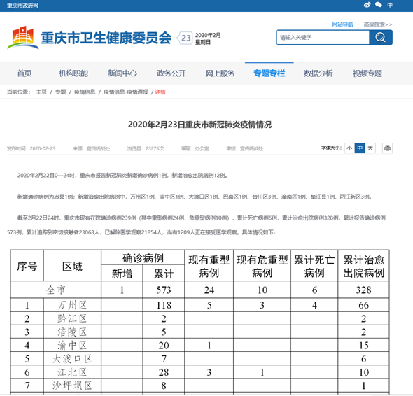 截至2月22日24时,重庆市现有在院确诊病例239例(其中重型病例24例、危重型病例10例),累计死亡病例6例,累计治愈出院病例328例,累计报告确诊病例573例。累计追踪到密切接触者23063人,已解除医学观察21854人,尚有1209人正在接受医学观察。具体情况如下:
