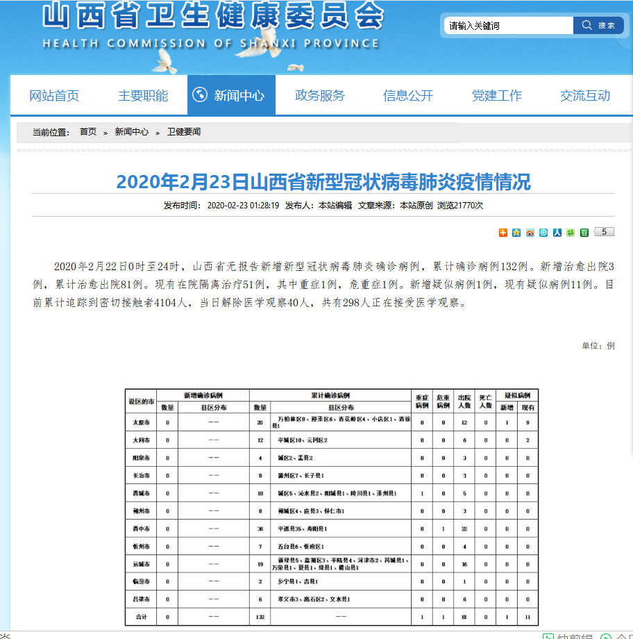 2020年2月22日0时至24时,山西省无报告新增新型冠状病毒肺炎确诊病例,累计确诊病例132例。新增治愈出院3例,累计治愈出院81例。现有在院隔离治疗51例,其中重症1例,危重症1例。新增疑似病例1例,现有疑似病例11例。目前累计追踪到密切接触者4104人,当日解除医学观察40人,共有298人正在接受医学观察。