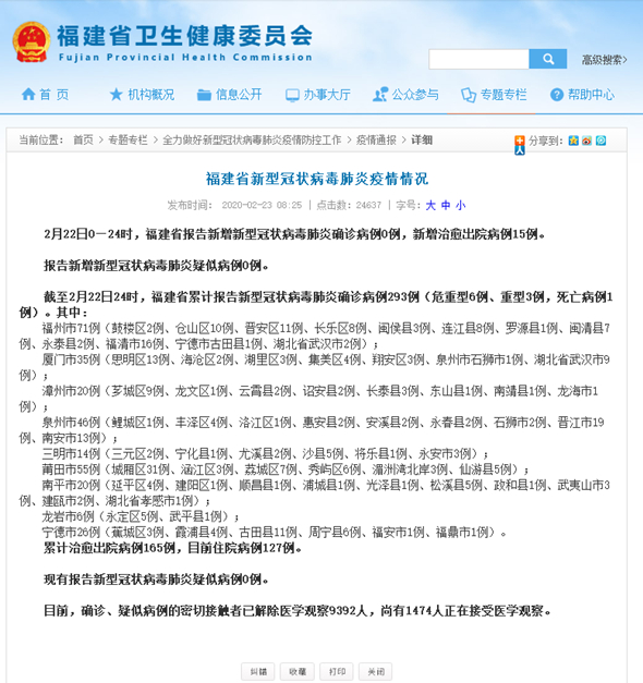 2月22日0—24时,福建省报告新增新型冠状病毒肺炎确诊病例0例,新增治愈出院病例15例。