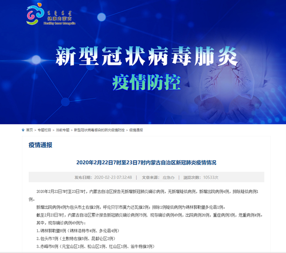 2020年2月22日7时至23日7时,内蒙古自治区报告无新增新冠肺炎确诊病例,无新增疑似病例,新增出院病例4例,排除疑似病例1例。
