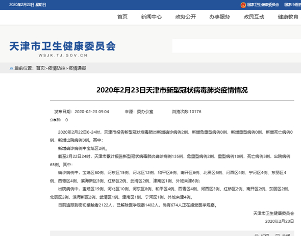 2020年2月22日0-24时,天津市报告新型冠状病毒肺炎新增确诊病例2例,新增危重型病例0例,新增重型病例0例,新增死亡病例0例,新增出院病例3例。其中: