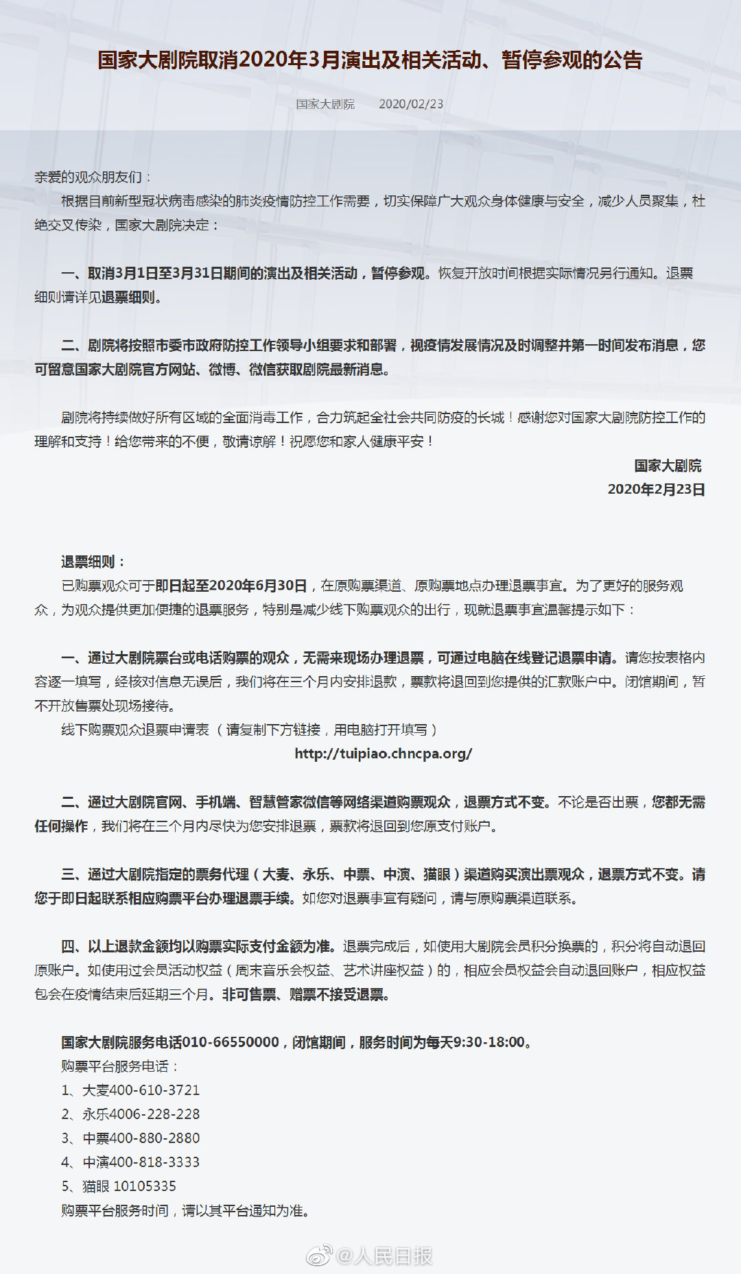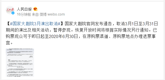 国家大剧院官网发布通告,取消3月1日至3月31日期间的演出及相关活动,暂停参观。恢复开放时间将根据实际情况另行通知。已购票观众可于即日起至2020年6月30日,在原购票渠道、原购票地点办理退票事宜。