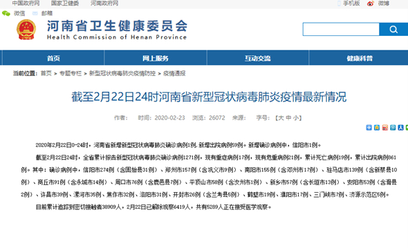 2020年2月22日0-24时,河南省新增新型冠状病毒肺炎确诊病例1例,新增出院病例59例。新增确诊病例中,信阳市1例。