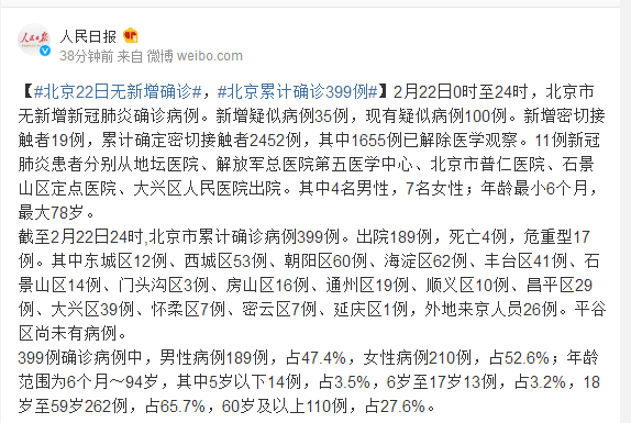 截至2月22日24时,北京市累计确诊病例399例。出院189例,死亡4例,危重型17例。其中东城区12例、西城区53例、朝阳区60例、海淀区62例、丰台区41例、石景山区14例、门头沟区3例、房山区16例、通州区19例、顺义区10例、昌平区29例、大兴区39例、怀柔区7例、密云区7例、延庆区1例,外地来京人员26例。平谷区尚未有病例。