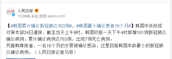 另据韩媒报道,一名16个月的女婴被确诊感染,这是目前韩国年龄最小的新冠肺炎确诊病例。(人民日报记者马菲)