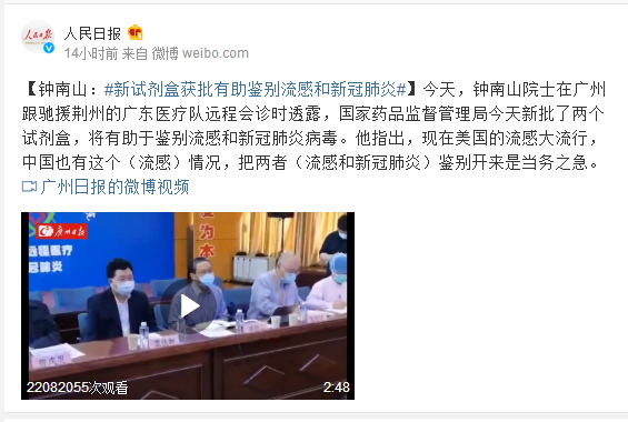 今天,钟南山院士在广州跟驰援荆州的广东医疗队远程会诊时透露,国家药品监督管理局今天新批了两个试剂盒,将有助于鉴别流感和新冠肺炎病毒。他指出,现在美国的流感大流行,中国也有这个(流感)情况,把两者(流感和新冠肺炎)鉴别开来是当务之急。