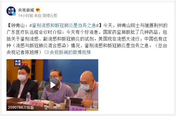 今天,钟南山院士与驰援荆州的广东医疗队远程会诊时介绍:今天有个好消息,国家药监局新批了几种药品,包括关于鉴别流感、副流感和新冠肺炎的试剂。美国现在流感大流行,中国也有这种(流感与新冠肺炎混合感染)情况,鉴别流感和新冠肺炎是当务之急。(总台央视记者陈旭婷)