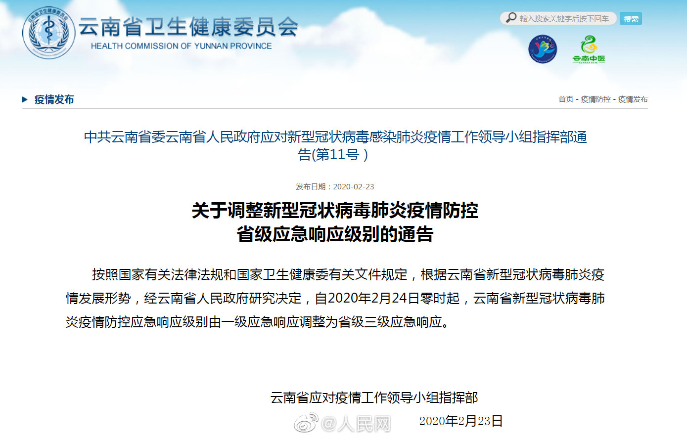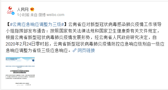 云南省应对新型冠状病毒感染肺炎疫情工作领导小组指挥部发布通告:按照国家有关法律法规和国家卫生健康委有关文件规定,根据云南省新型冠状病毒肺炎疫情发展形势,经云南省人民政府研究决定,自2020年2月24日零时起,云南省新型冠状病毒肺炎疫情防控应急响应级别由一级应急响应调整为省级三级应急响应。