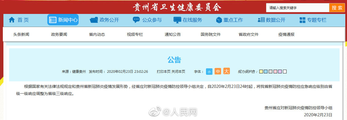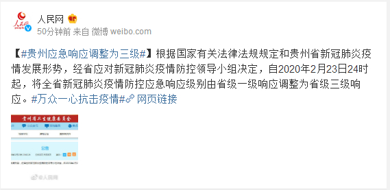 根据国家有关法律法规规定和贵州省新冠肺炎疫情发展形势,经省应对新冠肺炎疫情防控领导小组决定,自2020年2月23日24时起,将全省新冠肺炎疫情防控应急响应级别由省级一级响应调整为省级三级响应。