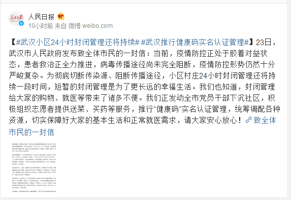 23日,武汉市人民政府发布致全体市民的一封信:当前,疫情防控正处于胶着对垒状态,患者救治正全力推进,病毒传播途径尚未完全阻断,疫情防控形势仍然十分严峻复杂。为彻底切断传染源、阻断传播途径,小区村庄24小时封闭管理还将持续一段时间,短暂的封闭管理是为了更长远的幸福生活。我们也知道,封闭管理给大家的购物、就医等带来了诸多不便。我们正发动全市党员干部下沉社区,积极组织志愿者提供送菜、买药等服务,推行“健康码”实名认证管理,统筹调配各种资源,切实保障好大家的基本生活和正常就医需求,请大家安心放心!