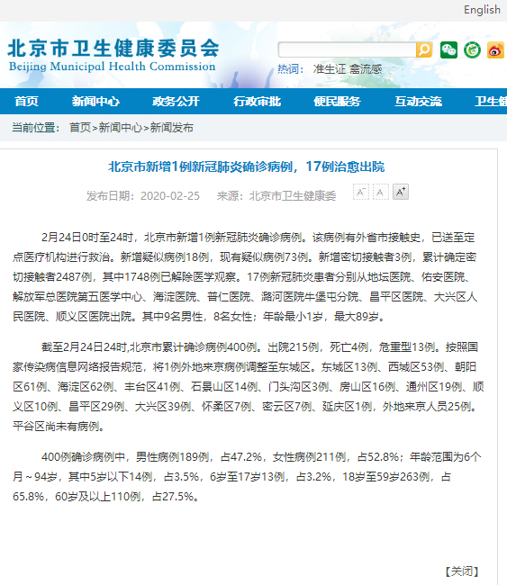 截至2月24日24时,北京市累计确诊病例400例。出院215例,死亡4例,危重型13例。按照国家传染病信息网络报告规范,将1例外地来京病例调整至东城区。东城区13例、西城区53例、朝阳区61例、海淀区62例、丰台区41例、石景山区14例、门头沟区3例、房山区16例、通州区19例、顺义区10例、昌平区29例、大兴区39例、怀柔区7例、密云区7例、延庆区1例,外地来京人员25例。平谷区尚未有病例。
