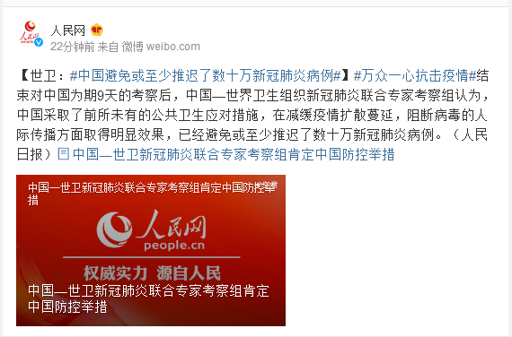 #万众一心抗击疫情#结束对中国为期9天的考察后,中国—世界卫生组织新冠肺炎联合专家考察组认为,中国采取了前所未有的公共卫生应对措施,在减缓疫情扩散蔓延,阻断病毒的人际传播方面取得明显效果,已经避免或至少推迟了数十万新冠肺炎病例。(人民日报)
