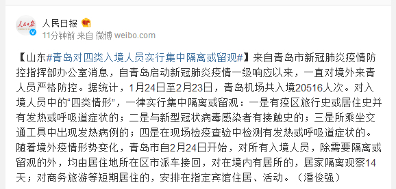 来自青岛市新冠肺炎疫情防控指挥部办公室消息,自青岛启动新冠肺炎疫情一级响应以来,一直对境外来青人员严格防控。据统计,1月24日至2月23日,青岛机场共入境20516人次。对入境人员中的“四类情形”,一律实行集中隔离或留观:一是有疫区旅行史或居住史并有发热或呼吸道症状的;二是与新型冠状病毒感染者有接触史的;三是所乘坐交通工具中出现发热病例的;四是在现场检疫查验中检测有发热或呼吸道症状的。