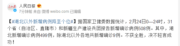据国家卫健委数据统计,2月24日0—24时,31个省(自治区、直辖市)和新疆生产建设兵团报告新增确诊病例508例。其中,湖北新增确诊病例499例,除湖北以外各地共新增确诊9例。不获全胜,决不轻言成功!