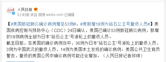 美国疾病控制与预防中心(CDC)24日确认,美国已确诊53例新冠肺炎病例,新增的18例病例全部为日本“钻石公主”号游轮上的撤侨人员。
