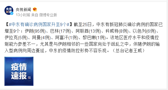 截至25日,中东有新冠肺炎确诊病例的国家已增至9个:伊朗(95例)、巴林(17例)、阿联酋(13例)、科威特(8例)、以色列(6例)、伊拉克(5例)、阿曼(4例)、阿富汗(1例)、黎巴嫩(1例)。该地区医疗水平和疫情控制能力参差不一,尤其是与伊朗相邻的一些国家尚处于战乱之中,伴随伊朗的输入型病例向周边蔓延,中东的疫情防控形势不容乐观。(总台记者王威)