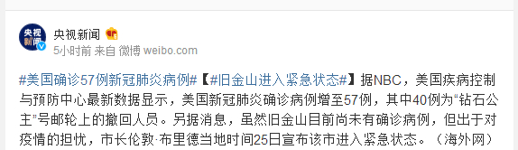 据NBC,美国疾病控制与预防中心最新数据显示,美国新冠肺炎确诊病例增至57例,其中40例为“钻石公主”号邮轮上的撤回人员。另据消息,虽然旧金山目前尚未有确诊病例,但出于对疫情的担忧,市长伦敦·布里德当地时间25日宣布该市进入紧急状态。