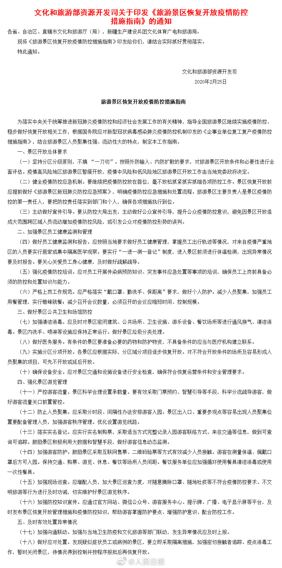 文化和旅游部资源开发司2月25日发布《旅游景区恢复开放疫情防控措施指南》。文件提到,景区开放要坚持分区分级原则,不搞 “一刀切”。疫情高风险地区旅游景区暂缓开放,疫情中风险和低风险地区旅游景区开放工作由当地党委政府决定。景区游览管理方面,应严控游客流量、防止人员聚集、落实实名登记。