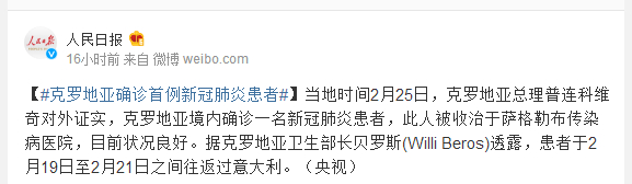 当地时间2月25日,克罗地亚总理普连科维奇对外证实,克罗地亚境内确诊一名新冠肺炎患者,此人被收治于萨格勒布传染病医院,目前状况良好。据克罗地亚卫生部长贝罗斯(Willi Beros)透露,患者于2月19日至2月21日之间往返过意大利。(央视)