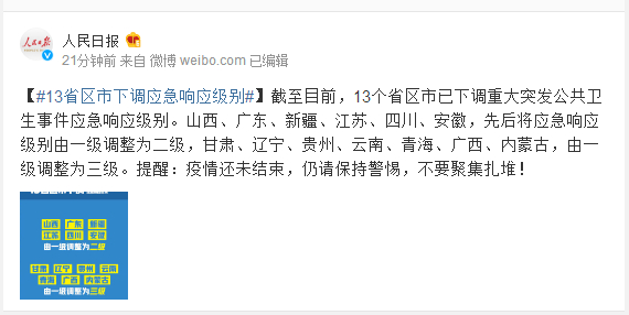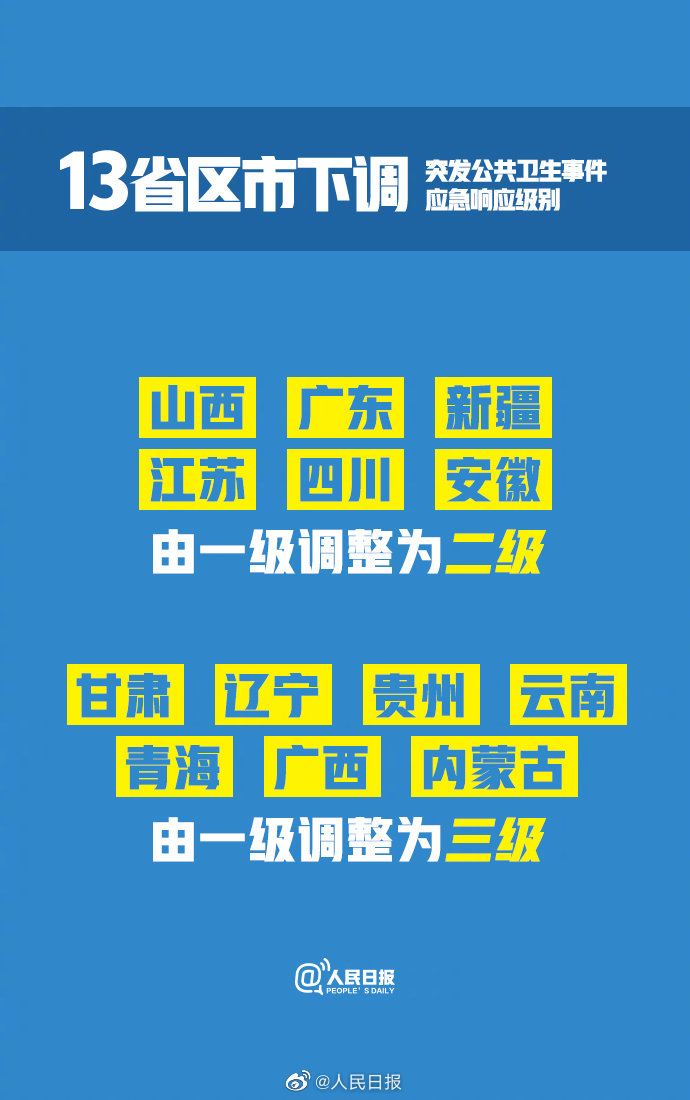 截至目前,13个省区市已下调重大突发公共卫生事件应急响应级别。山西、广东、新疆、江苏、四川、安徽,先后将应急响应级别由一级调整为二级,甘肃、辽宁、贵州、云南、青海、广西、内蒙古,由一级调整为三级。提醒:疫情还未结束,仍请保持警惕,不要聚集扎堆!