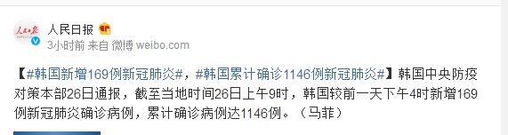 韩国中央防疫对策本部26日通报,截至当地时间26日上午9时,韩国较前一天下午4时新增169例新冠肺炎确诊病例,累计确诊病例达1146例。(马菲)