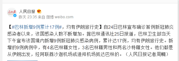自24日巴林宣布确诊首例新冠肺炎感染者以来,该国感染人数不断增加。据巴林通讯社25日报道,巴林卫生部当天下午宣布该国境内新增9例新冠肺炎感染病例,累计达17例,均有伊朗旅行史。新增的9例病例中,有4名巴林籍女性,3名巴林籍男性和两名沙特籍女性。他们都是从伊朗出发,经阿联酋沙迦机场或迪拜机场抵达巴林的。(人民日报记者周輖)