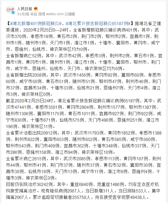 据湖北省卫健委通报,2020年2月25日0—24时,全省新增新冠肺炎确诊病例401例,其中:武汉市370例、孝感市19例、黄石市3例、荆门市2例、鄂州市2例、宜昌市1例、荆州市1例、随州市1例、天门市1例、潜江市1例,十堰市、襄阳市、黄冈市、咸宁市、恩施州、仙桃市、神农架林区均为0例。