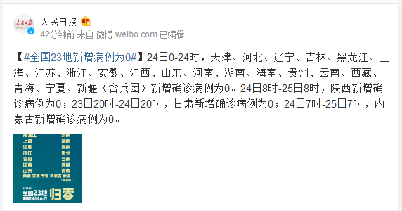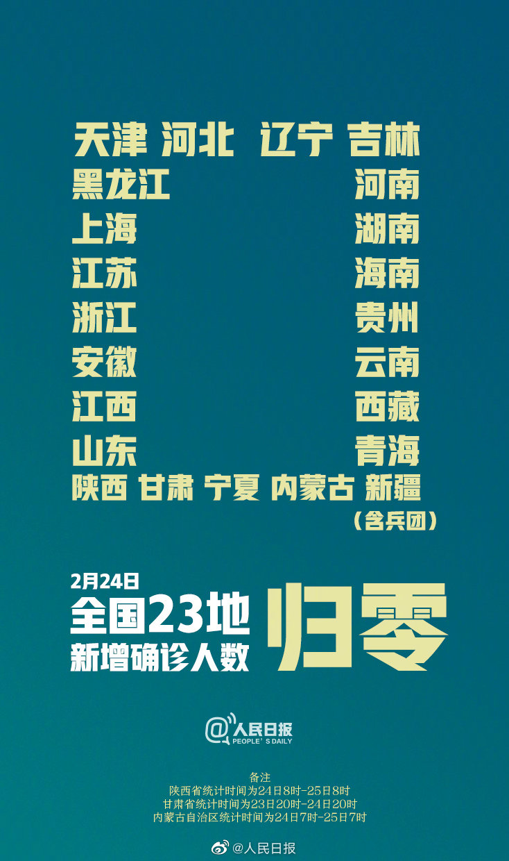 24日0-24时,天津、河北、辽宁、吉林、黑龙江、上海、江苏、浙江、安徽、江西、山东、河南、湖南、海南、贵州、云南、西藏、青海、宁夏、新疆(含兵团)新增确诊病例为0。24日8时-25日8时,陕西新增确诊病例为0;23日20时-24日20时,甘肃新增确诊病例为0;24日7时-25日7时,内蒙古新增确诊病例为0。