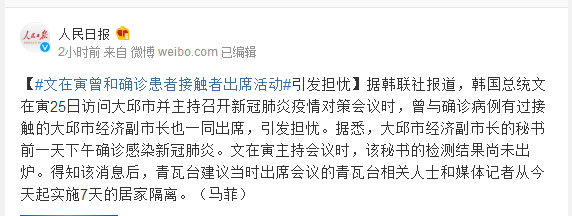 据韩联社报道,韩国总统文在寅25日访问大邱市并主持召开新冠肺炎疫情对策会议时,曾与确诊病例有过接触的大邱市经济副市长也一同出席,引发担忧。据悉,大邱市经济副市长的秘书前一天下午确诊感染新冠肺炎。文在寅主持会议时,该秘书的检测结果尚未出炉。得知该消息后,青瓦台建议当时出席会议的青瓦台相关人士和媒体记者从今天起实施7天的居家隔离。(马菲)