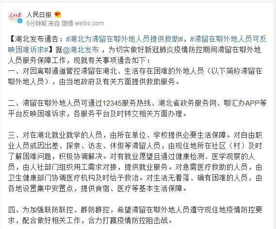 据@湖北发布 ,为切实做好新冠肺炎疫情防控期间滞留在鄂外地人员服务保障工作,现就有关事项通告如下:
